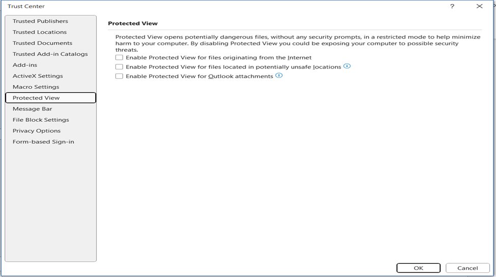 If these files open in a ‘Protected mode’ (default mode for downloaded documents by Microsoft), please ensure that these documents are resaved after ‘enabling editing’.
