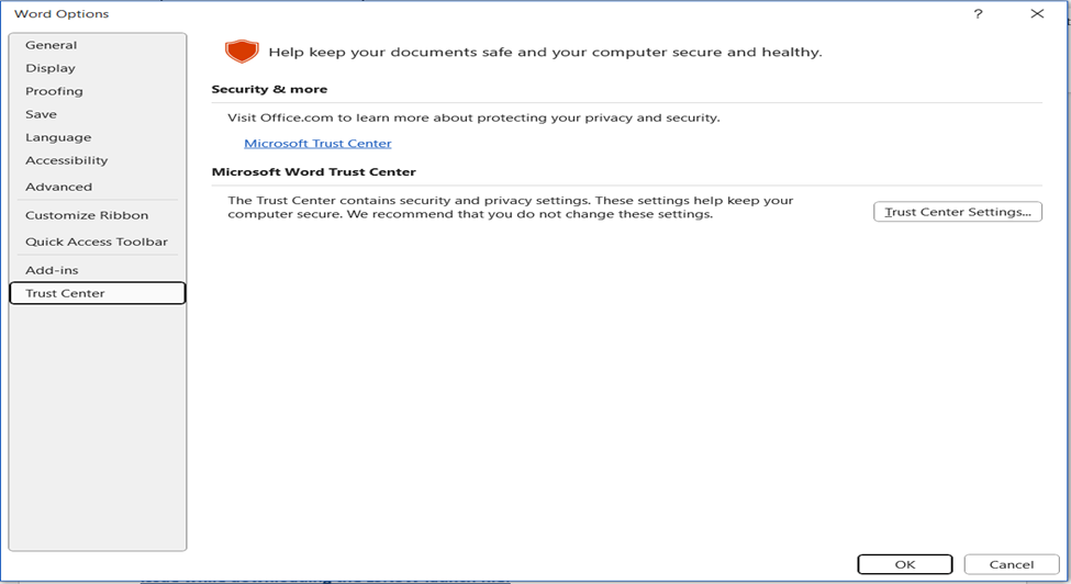 To make all the Word Documents Unprotected, Navigate to the Options in the Word application and click on Trust Center.