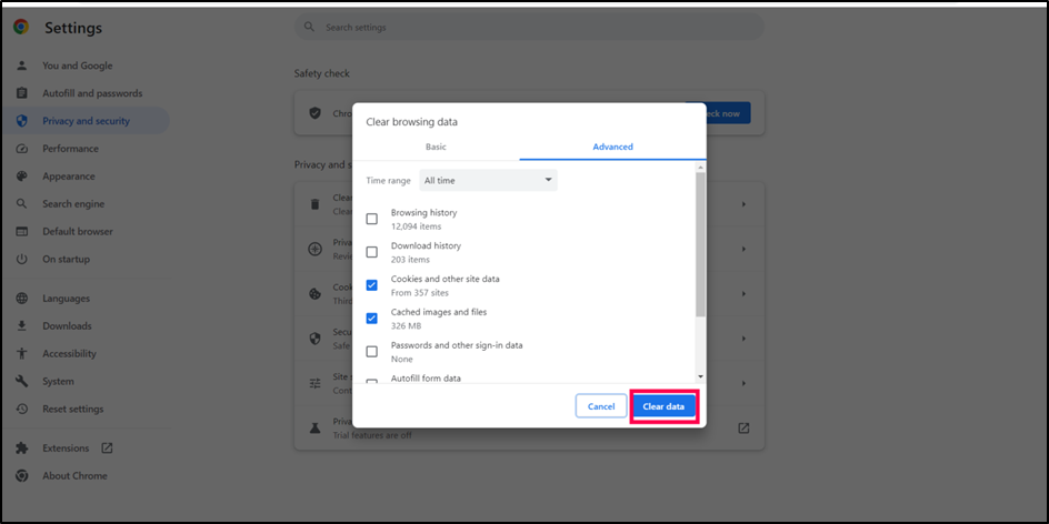 4. Select – Cookies and other site data and Cached image and file. Click on Clear Data.