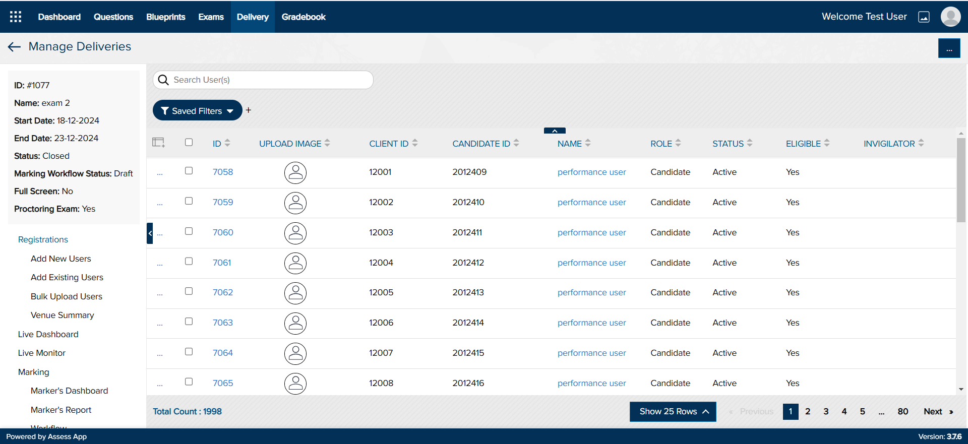 In the Delivery Module, the list of exams will be displayed. When the required exam is selected the list of users will be displayed.
