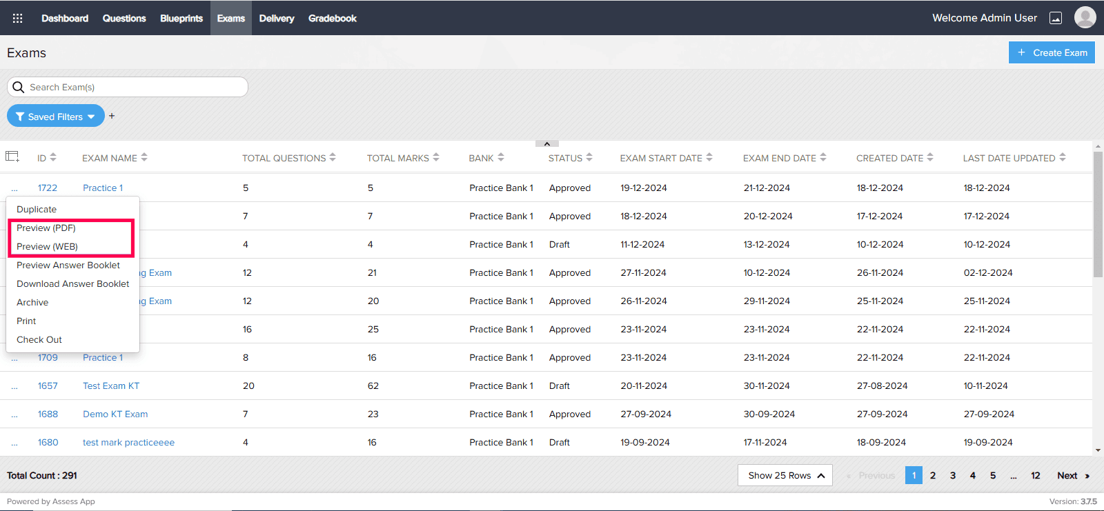 Yes, you can preview the Exam you’ve created in two formats: PDF and web. To do this, click on the ellipsis next to the Exam, and a menu will appear with the available options.