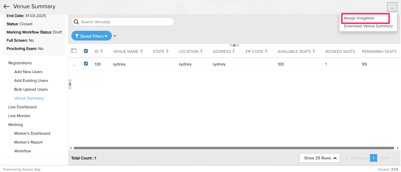 The Venue Summary provides a quick overview of all the configured venues for an online assessment. It displays essential details such as the venue name, location, and the number of available, booked, and remaining seats.